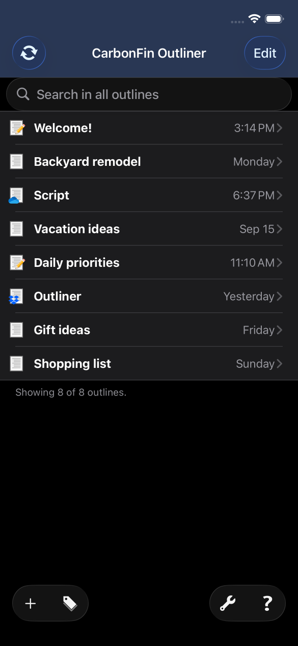 Tap the '+' button to create a new outline, or 'Edit' to reorder them.